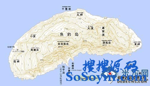 资料图:日本国土地理院非法测绘的1:2.5万比例尺钓鱼岛地形图。地势北部较平坦,南部陡峭,中央山脉横贯东西;有4条主要溪流。